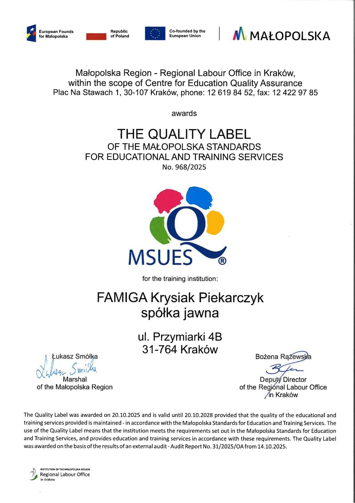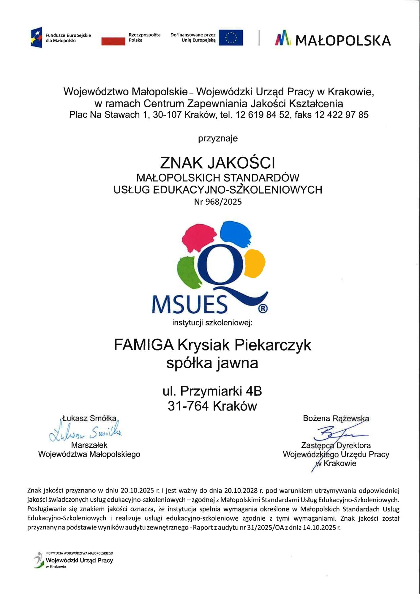 Potwierdza to Znak Jakości Małopolskich Standardów Edukacyjno-Szkoleniowych MSUES